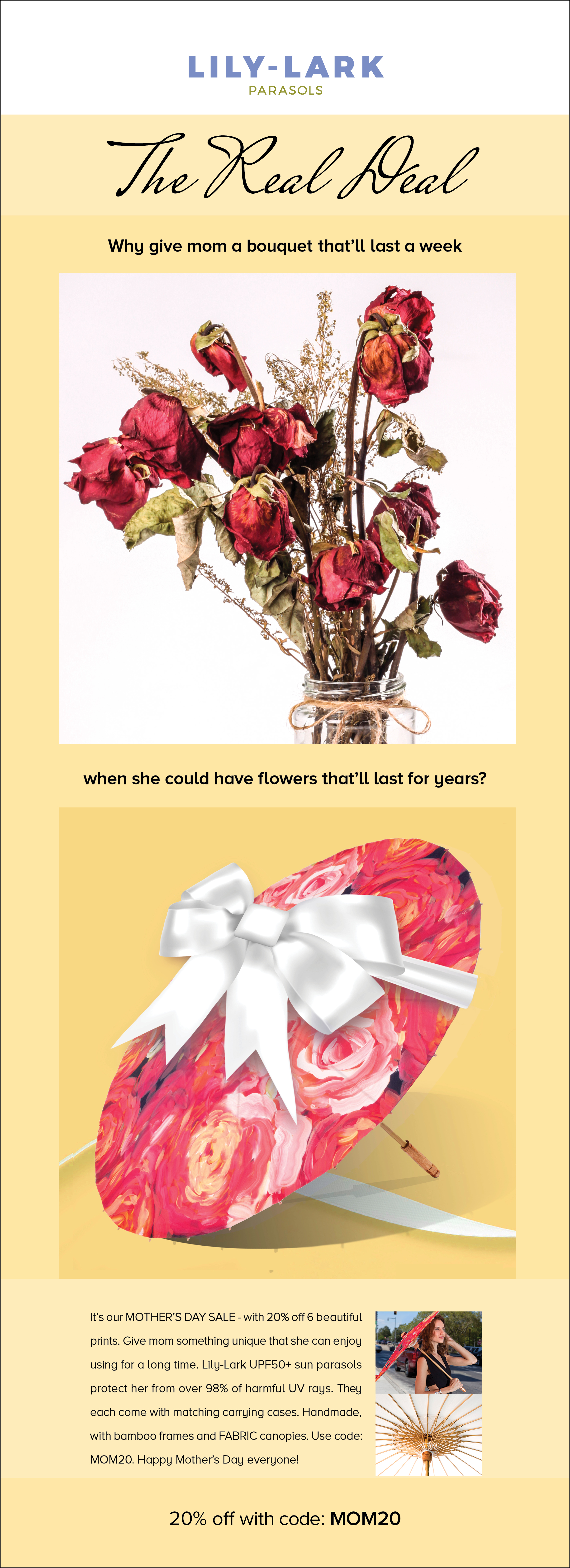 Lily-Lark makes UV-protective bamboo sun parasols and matching hand fans. It’s the first unique sunsafe accessory for women to use in a more fashion-forward context, while protecting themselves from the harmful and aging rays of the sun. With a UPF 50+ coating, the parasols protect the user from over 99% of the sun’s UV rays, and the canopies are printed with contemporary fine art. With the planet getting hotter, standing under the shade of a parasol and using a hand fan are getting more popular by the minute.
